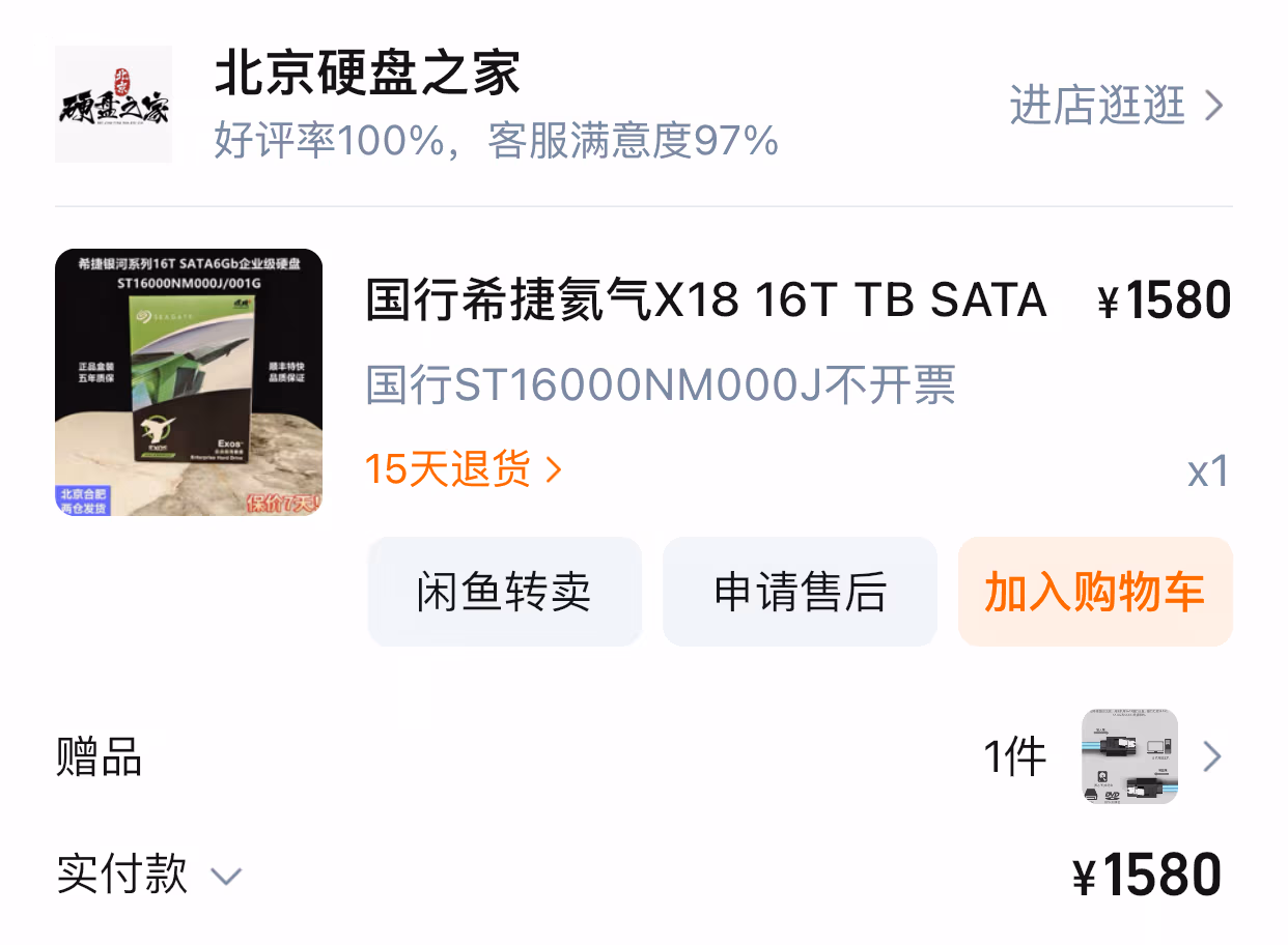 2023 年 4 月份买第一张盘(希捷)的时候1才 ¥1580,大概 ¥100/TB。大概是随着最近大语言模型的需求,硬盘这涨得也太离谱了……