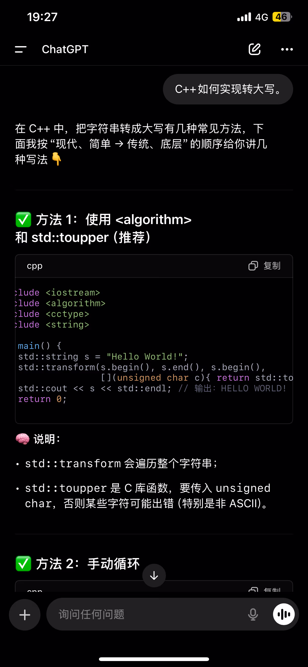 快 2026 年了,C++ 转换大小写为什么还是如此垃圾? 1 2 3 4 5 6 7 8 9 10 11 12 #include <iostream> #include <algorithm> #include <cctype> #include <string> int main() { std::string s = "Hello World!"; std::transform(s.begin(), s.end(), s.begin(), [](unsigned char c){ return std::toupper(c); }); std::cout << s << std::endl; // 输出:HELLO WORLD! return 0; } 学学隔壁 Swift 写 extension 吧。 geniusvczh on X: "@pK7qkLEE6TKEBRs 用stl🤪" / X 陪她去流浪 碎碎念 桃子 3 天前