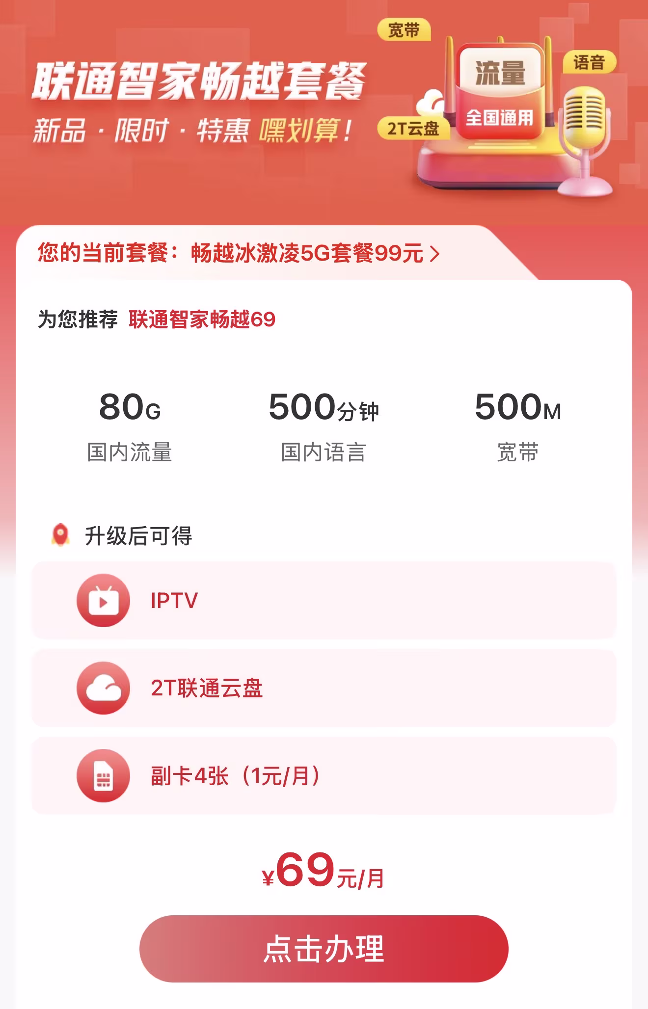 于是随意打开了中国联通App看了看,意外发现它竟然提示我升级到月租更少、流量更多、宽带更大的套餐?良心发现?
