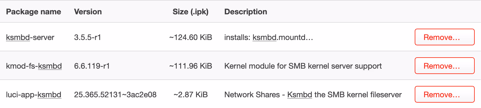 厌倦了Intel NUC的风扇狂转,突发奇想把32TB的硬盘柜插在了路由器屁股后面,一句话安装了USB存储模块2后,居然秒识别??!那我就得想办法榨干它的性能价值了!然后就是如何把它分享给局域网,OpenWRT的包管理这么好用,应该有好用的UI?安装Samba的时候竟然让我选Samba还是Ksmbd3。前者让我不适;第一次听说后者,仔细研究了一下:
