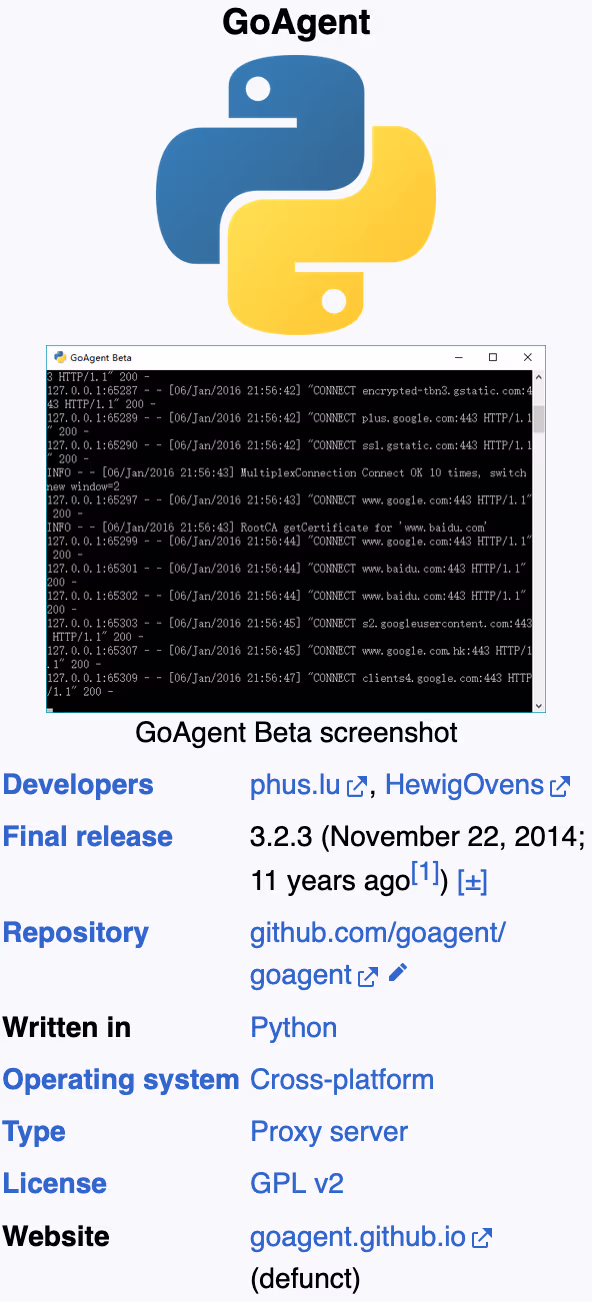 意外想起GoAgent这个早期的🪜,然后翻看了一眼维基百科。正准备离开时,居然发现一个非常熟悉的开发者名字:phus.lu。
